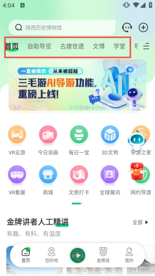 打开软件后,借助顶部的【首页】【自助导览】【古建世遗】【文博】【学堂】等标签,能够快速切换查看不同板块的内容。