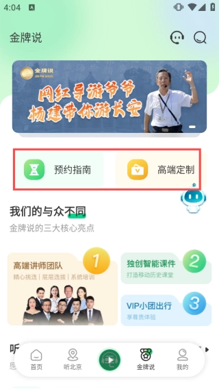 进入【金牌说】页面后,点击【预约指南】就能知晓预约流程,点击【高端定制】则可获得个性化服务,以此满足各类不同的需求。