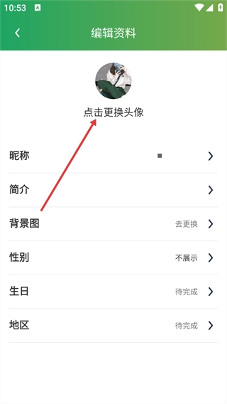 在资料编辑页面,点击“点击更换头像”的提示区域。