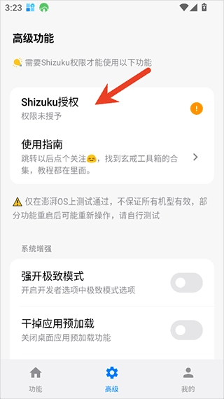 部分高级功能需要用户先到Shizuku完成授权,获取adb调试权限后才能使用。授权操作很简单,在玄戒工具箱的高级界面点击Shizuku授权按钮就行。