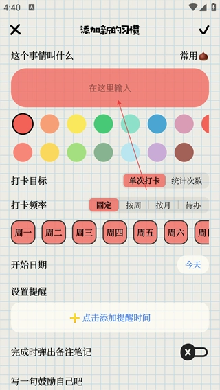 在“添加新习惯”的界面中,于输入框内填写习惯的名称,并选择好颜色、打卡规则等相关信息。