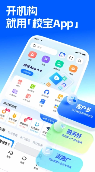 校宝是一款专为教育培训机构打造的全方位管理服务应用,集成了智能排课、财务管理、学生管理、点名记录、数据分析等实用功能,能为机构带来更便捷的办公体验。此外,它还提供智能教务、家校无缝互联、可视化排课、精准考勤等特色服务。通过校宝,用户可以制定个性化计划,高效管理师生信息,既能帮助学生和家长消除学习上的顾虑,也能为机构拓宽招生渠道。用户还能随时在线查看排课考勤情况,与家长实时沟通,快速解决工作问题,提升工作效率。感兴趣的朋友不妨关注校宝。