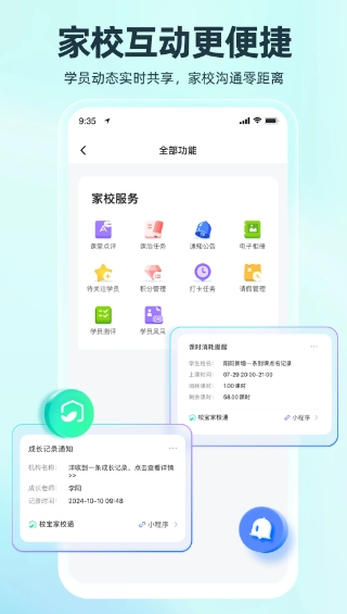 消息通知功能升级:系统将自动推送上课提醒、课消提醒及续费提醒,有效提升沟通效率。