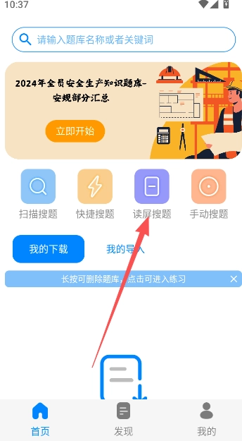 切换当前页面至首页,找到上方区域内的读屏搜题。