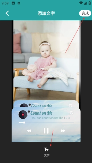 在添加文字的页面,点击【文字】按钮,添加好视频文字后,再点击【完成】按钮,就能完成整个操作流程了。