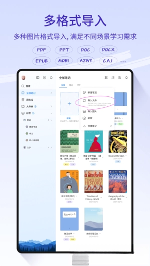 打开 StarNote 后,点击“导入”按钮,就能直接添加 PDF、Word、PPT、TXT 等多种类型的文件。