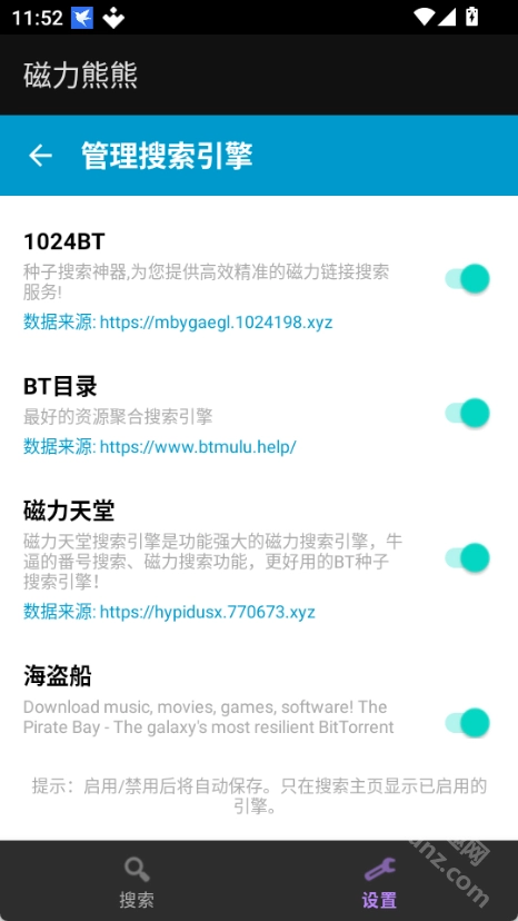 可以轻松管理、切换乃至禁用的优质磁力搜索引擎,让您能够自定义资源的来源渠道。