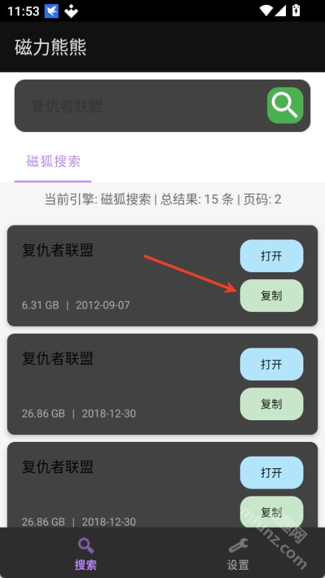 搜索结果支持一键复制磁力链接或直接调用外部工具。