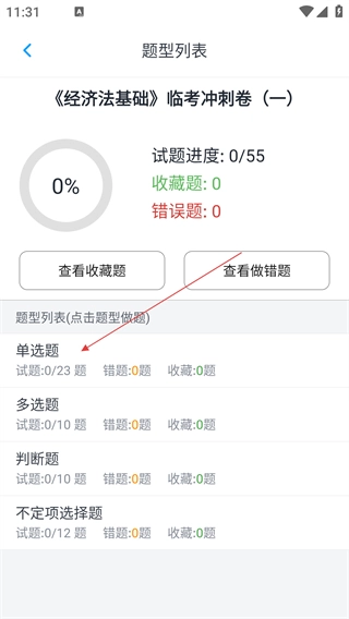 在考前冲刺页面选定目标模拟试题后,即可进入题型列表页面。