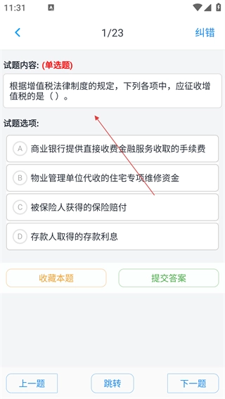 在试题界面,完成选项选择后,点击【提交答案】按钮就能完成该题的作答,也可以通过“上一题”“下一题”按钮来切换题目。