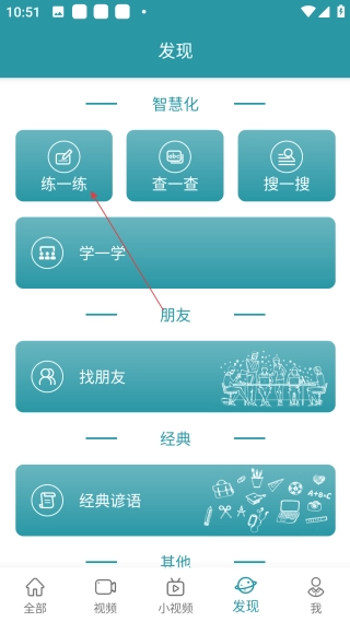 在发现页面,点击【练一练】按钮,即可进入训练营的课程选择页面。