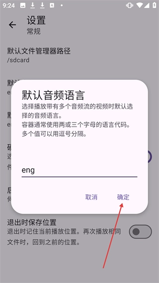 在mpv默认音频语言的设置弹窗里,完成设置后点击【确定】按钮就能保存相关配置了。