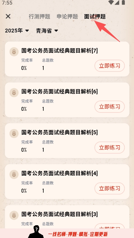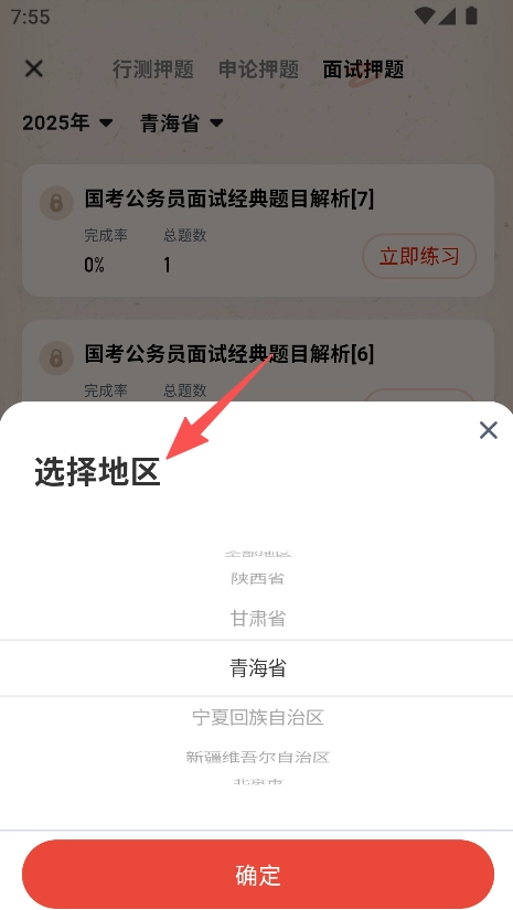 挑选面试押题,进入地区选择界面,确定好目标地区(例如青海省)。