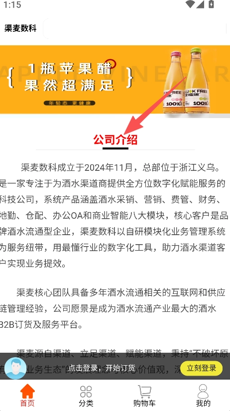 打开软件后,浏览公司介绍板块,从中了解企业的背景信息、各业务模块的情况以及未来发展愿景。