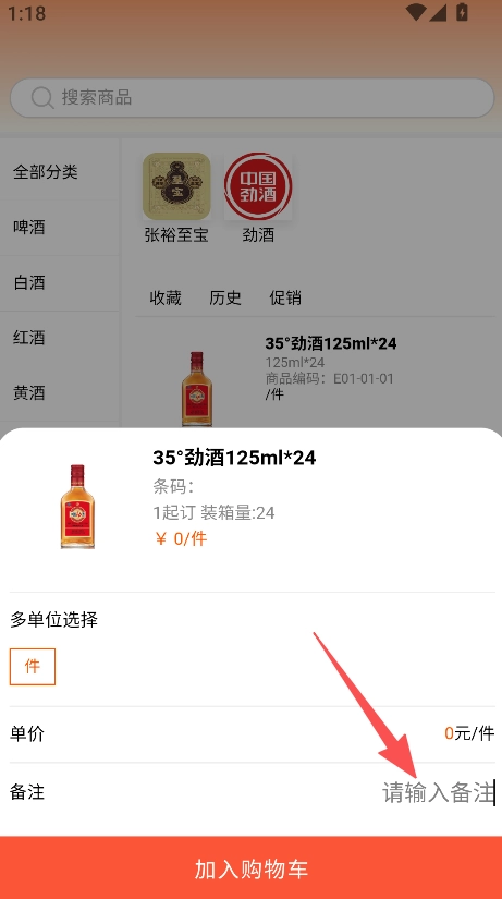 具备购物车管理能力,支持添加商品并填写备注,能让酒水采购过程中的商品管理与操作更便捷。
