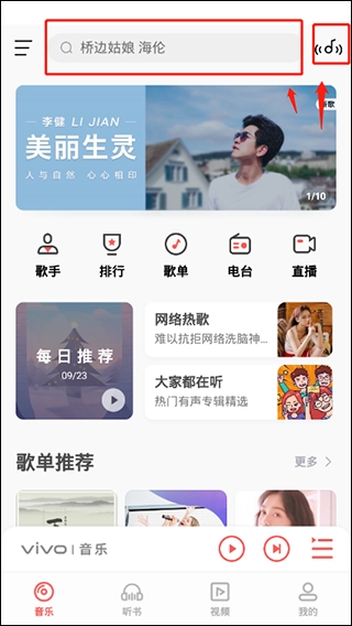 当你想要搜索歌曲时,可以在上方输入关键词,也可以通过右侧按钮的听歌识曲功能来快速查找。