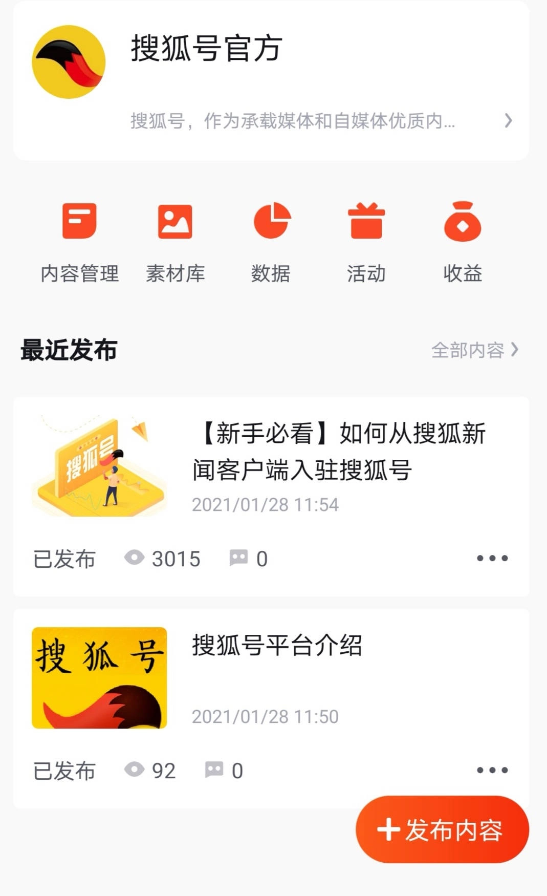 在搜狐号页面,您能够管理内容与素材库,查看图文数据的呈现效果,参与搜狐号发起的各类活动,以及了解近期的收益状况等。