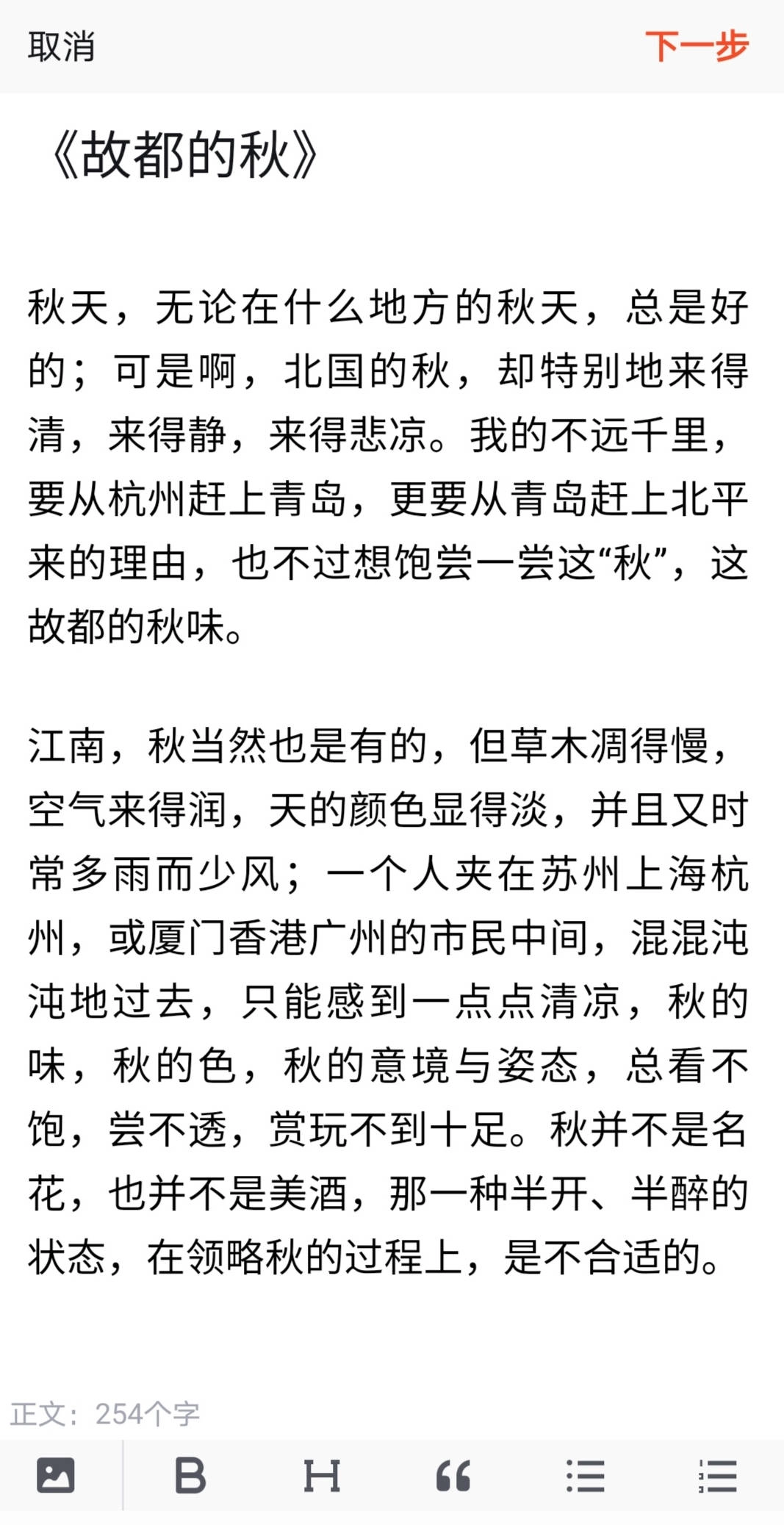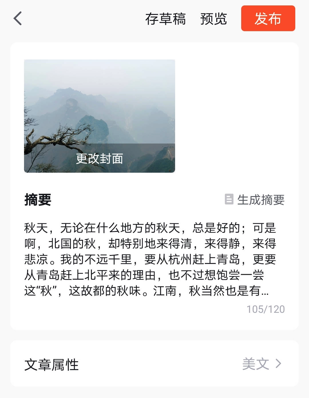 点击“发布文章”按钮,进入文章编辑界面,完成文章标题与正文的编辑工作。现阶段暂不支持图集和视频的发布,若有发布图集或视频的需求,请通过电脑端登录进行操作。