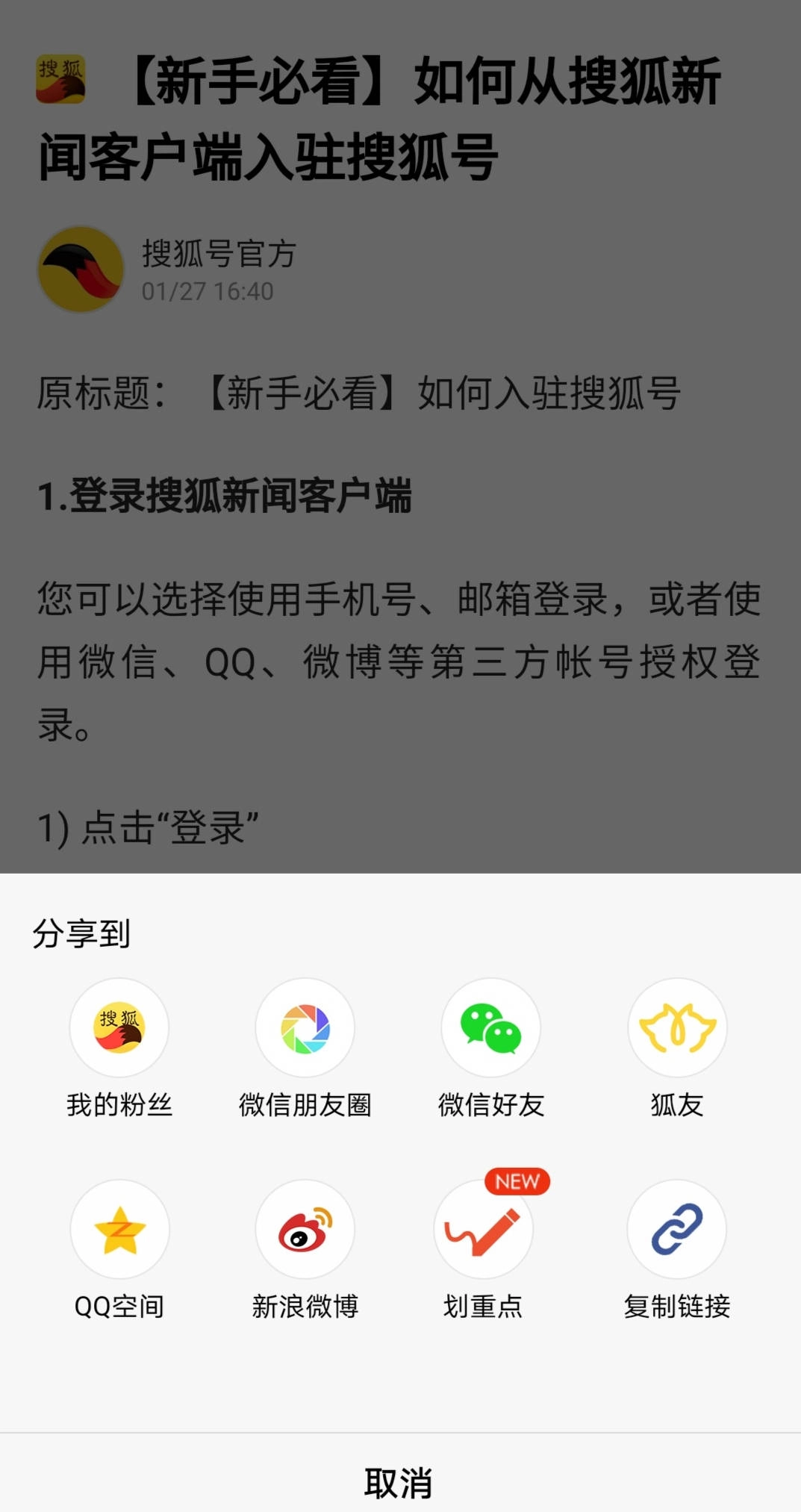 直接点击文章右下角的“分享”按钮,就可以把文章分享给粉丝、微信好友,也能分享到狐友、朋友圈、微博等平台。