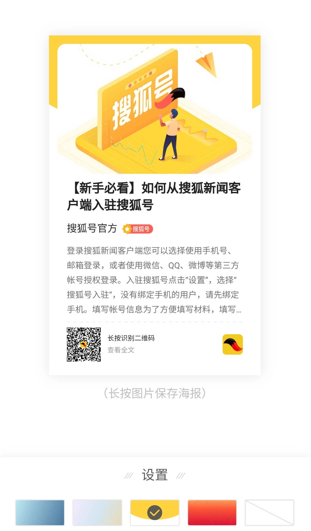 您还能把自己的文章制作成精美的海报来分享,收到分享的人扫描海报上的二维码,就能阅读文章,还能关注文章作者。