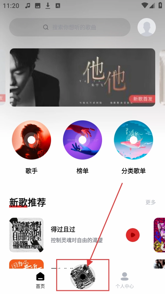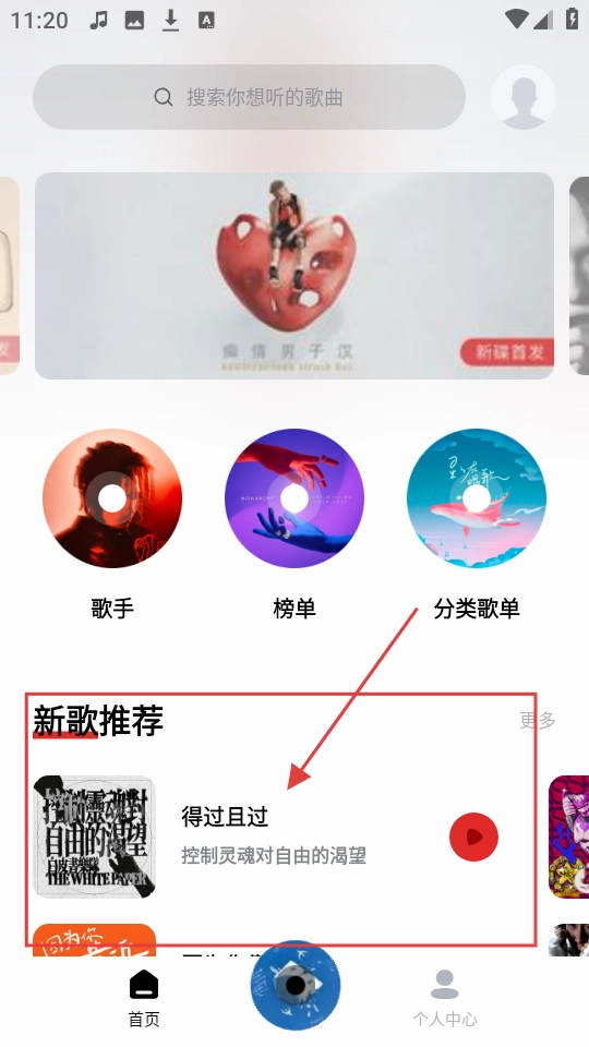 打开首页后,在新歌推荐区域挑选你想听的歌曲,像《得过且过》这类,点击播放按钮,就能开启歌曲播放了。