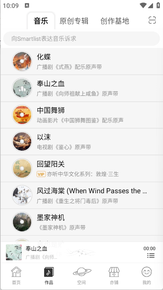 进入首页后,点击“作品”板块,即可获取海量音乐曲库资源。