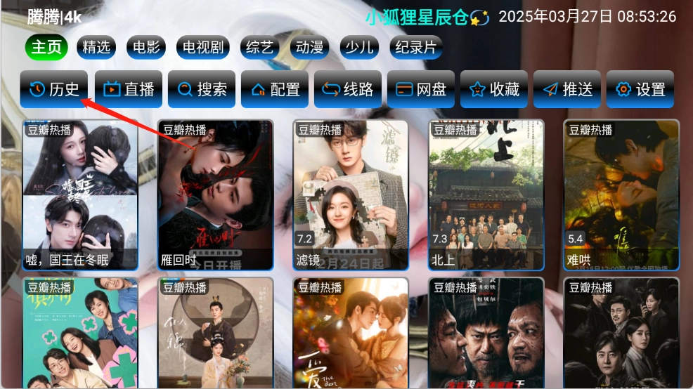 首页顶部栏汇聚了丰富多样的影视资源,涵盖电视剧、电影和综艺等内容。