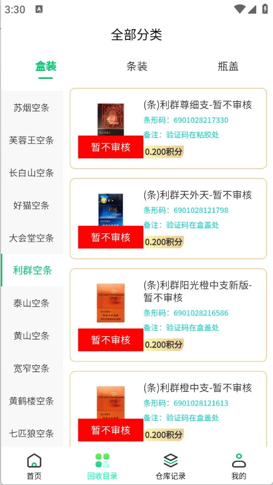 A:依据我们的市场调研结果,国内香烟品类大约有一千多种,而平台所回收的香烟包装,必须是烟厂推出了积分兑换活动的那些,其中烟盒的种类约有二百六十种,条盒(也就是整条香烟的外包装盒)的种类约有一百三十种。