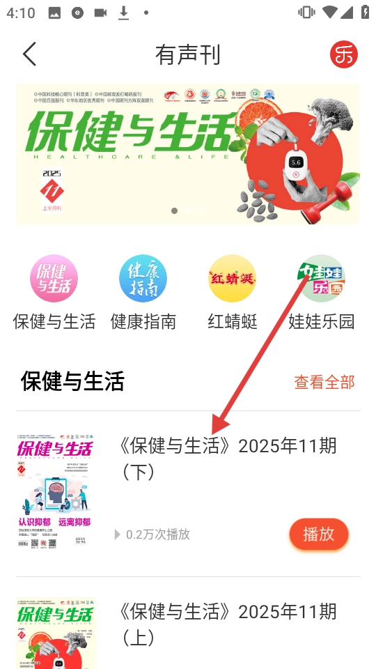 在有声刊板块里,找到《保健与生活》2026年11期(下),点击进入它的详情页面。