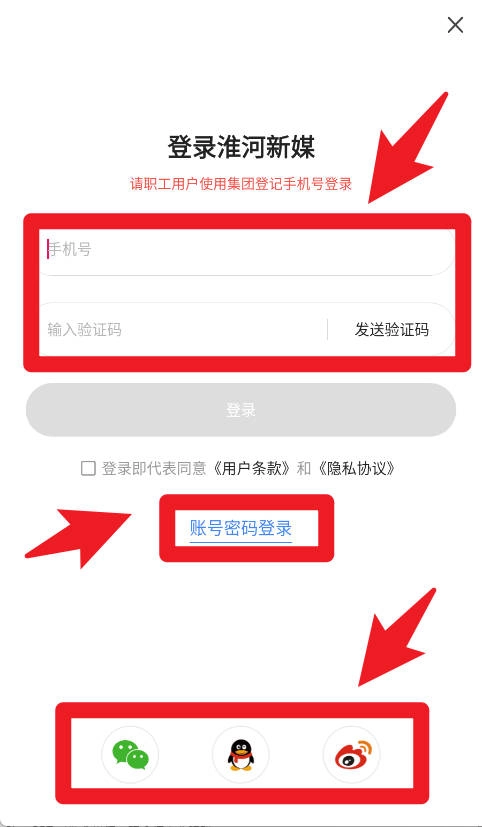 登录界面提供多种便捷登录方式,包括手机号快捷登录(输入手机号并获取验证码即可快速进入平台),以及账号密码登录、微信/QQ/微博第三方登录。