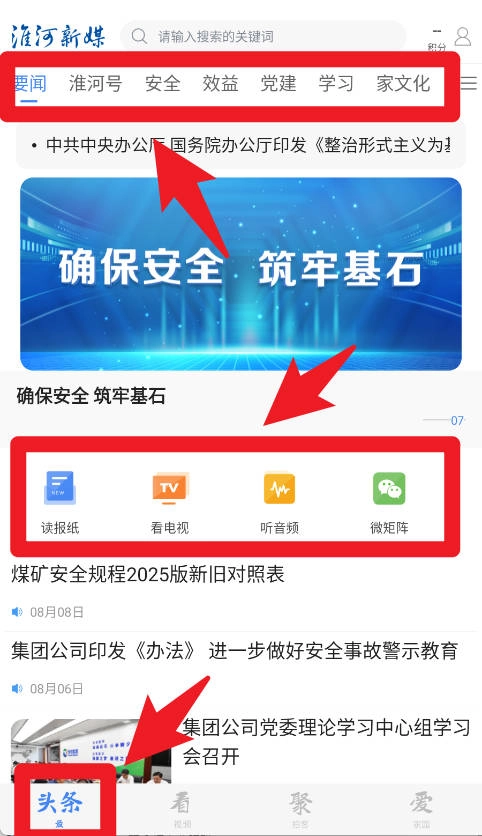 首页导航栏包含新闻、淮河号、安全等多个栏目,页面中部设有读报纸、看电视、听音频等功能入口,方便用户通过不同方式获取信息。