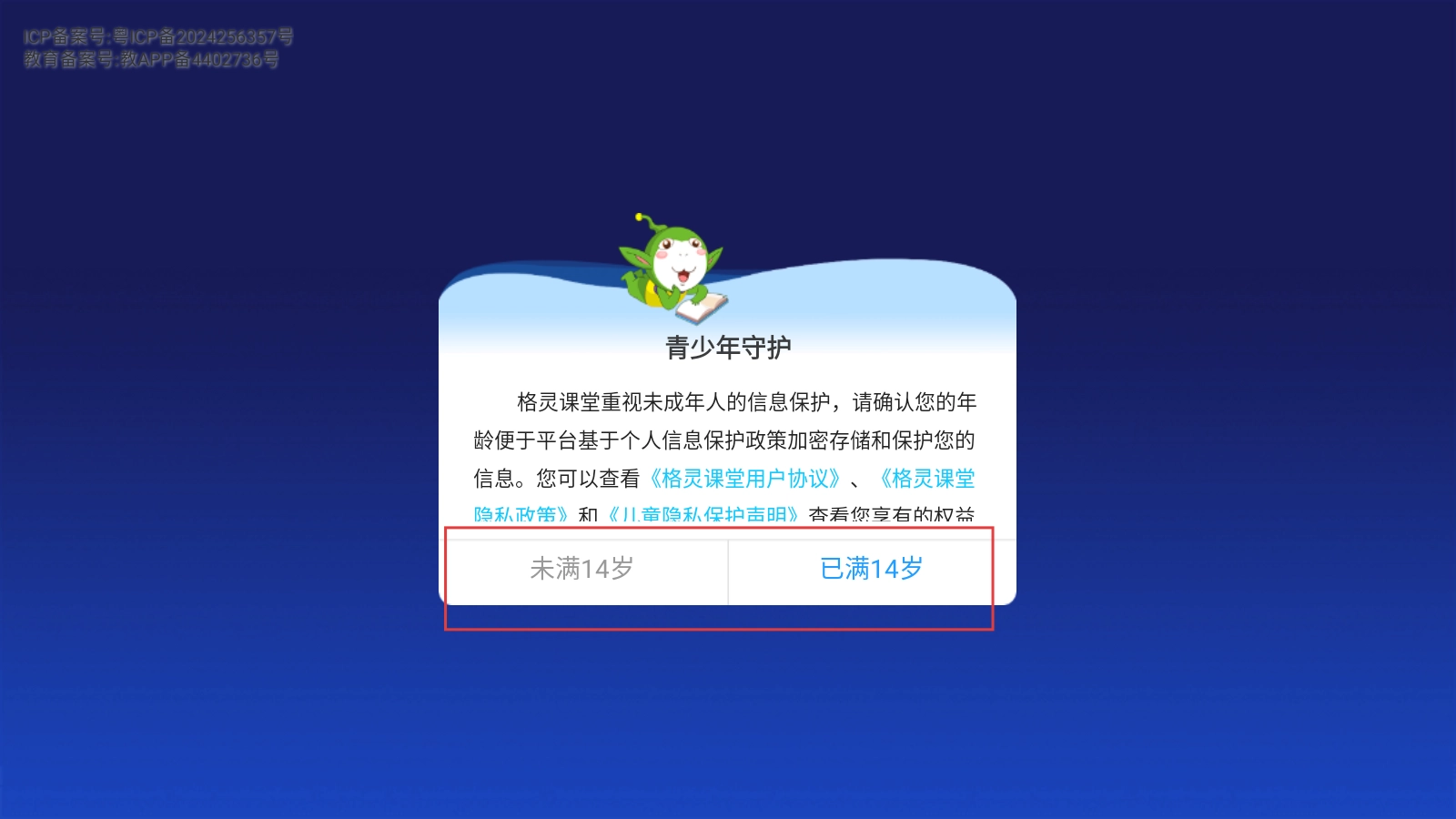 首次进入格灵课堂时,请依据实际年龄,选择【未满14岁】或【已满14岁】的选项进入。