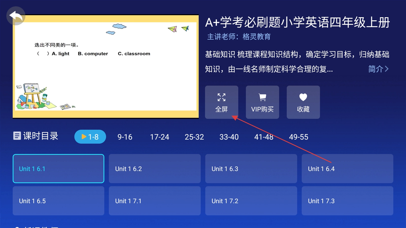 打开课程后,点击【全屏】按钮即可全屏观看课程内容。