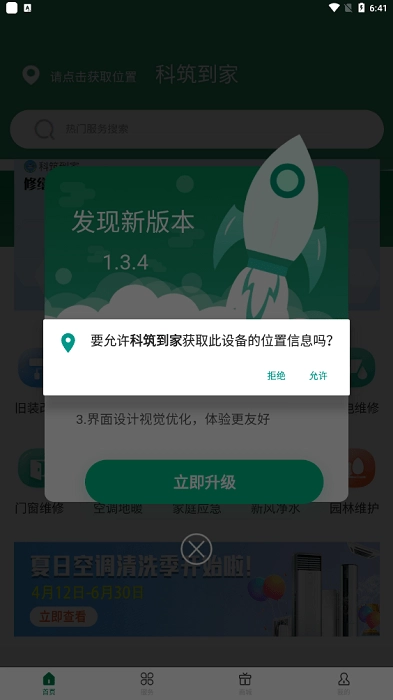是否允许科筑到家获取该设备的位置信息?请点击允许按钮。