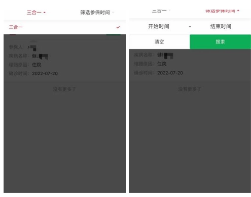 下拉选择参保项目、参保时间,页面自动刷新查询条件的相关信息,如下图:
