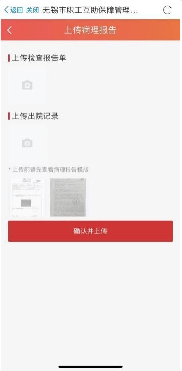 上传病理报告:点击理赔详情的上传病理报告按钮,在上传病理报告界面上传检查报告单、出院记录,点击确认并上传将提供的图片上传至后台审核,如下图:注:上传图片的格式为png、jpg、jpeg等正常格式。