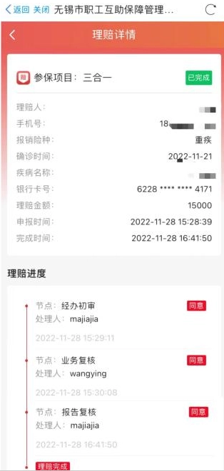 若要查询已完成的工单,可点击状态显示为“已完成”的理赔工单,进入详情界面后即可查看该理赔的详细记录,具体操作可参考下图: