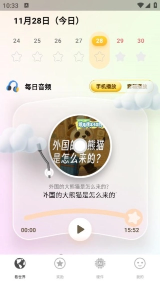 进入卡世界界面后,这里有每日更新的音频内容,你既可以用手机播放,也能通过音响来收听。