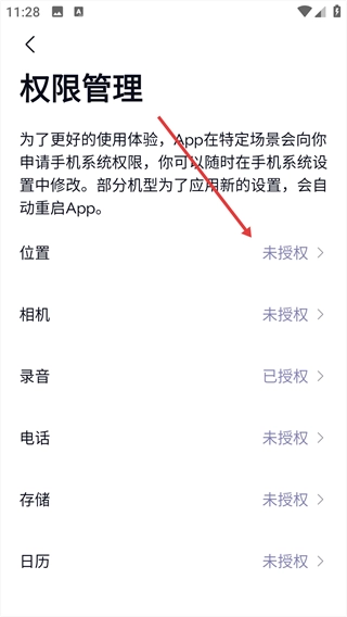 在权限管理页面,点击“位置”权限后,会弹出位置权限说明的弹窗。