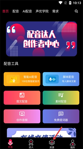 配音达人是专注于配音领域的互联网平台,涵盖视频配音、音频制作、配音学习、内容分发、声优学院五大核心模块。平台提供优质免费视频剪辑工具,支持提词拍摄创作音频,优质内容可一键分发;国内配音大咖入驻,专业配音讲师在线授课分享配音知识,众多配音爱好者齐聚交流。