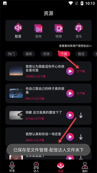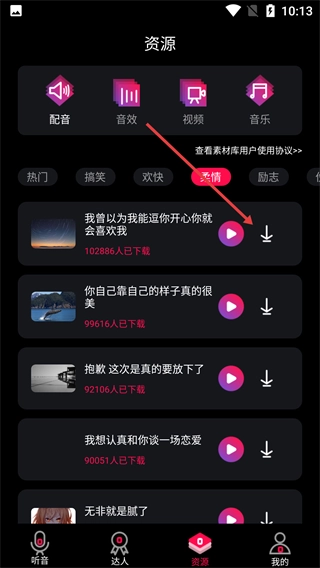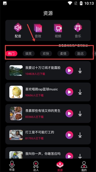 进入【资源】页面后,可切换顶部的素材分类,查看各类音频素材。