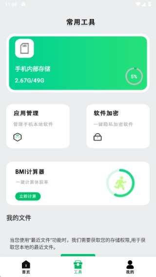在工具页面里,你能够开展应用管理操作,同时还具备软件加密以及BMI计算器的功能。