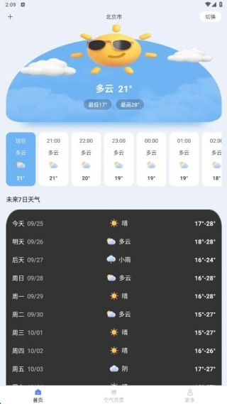 首页呈现了本地当日不同时段的天气变动状况,同时也包含未来7天的天气展望。