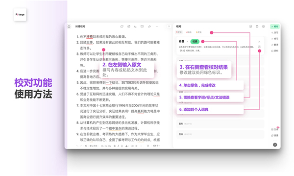 在左侧写作区写作或粘贴待校对的内容;右侧会实时进行校对并提供修改建议;