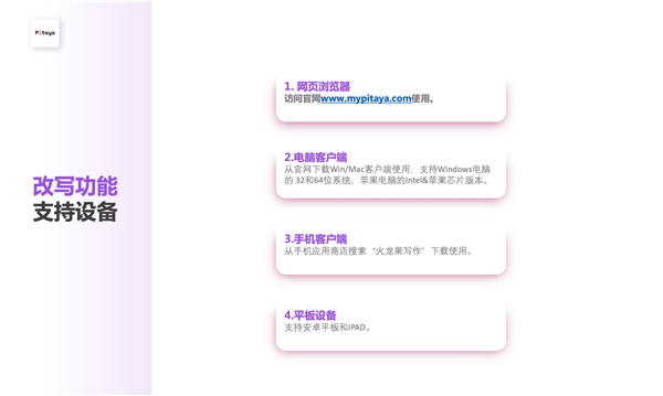 您可以在以下设备上使用火龙果的改写功能;这包括电脑客户端、手机客户端、平板设备和网页浏览器;