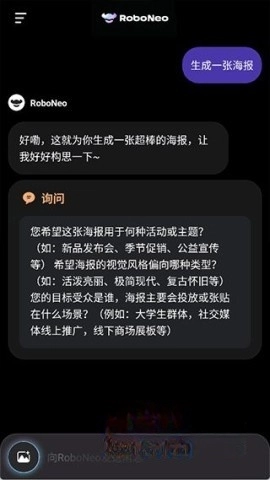 首先登录RoboNeo,然后与这位AI智能助手开启对话互动,比如可以请求它生成专属海报。