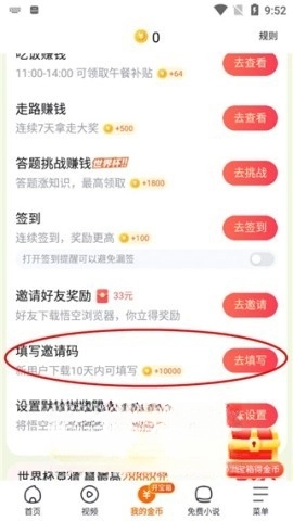 滑动找到“填写邀请码”选项,轻松绑定好友即可获取金币奖励。