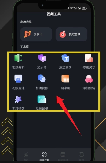 首页提供了去水印、音频提取、视频分割、加水印等功能。