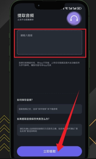 可以这样修改:在功能里加入音频提取功能,进入对应的提取界面(界面如图所示),先从其他短视频平台复制视频链接,再回到这个页面把链接粘贴进去。