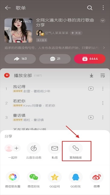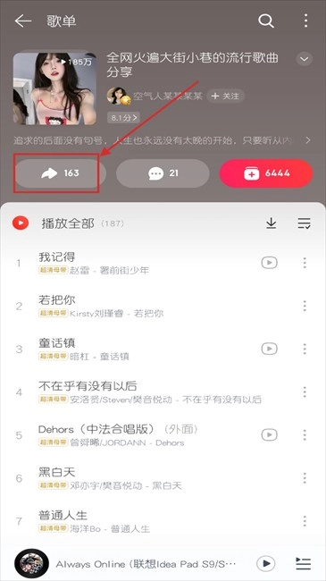 先打开网易云音乐的歌单详情页面,找到并选中想要导入的那个歌单,接着点击分享按钮。